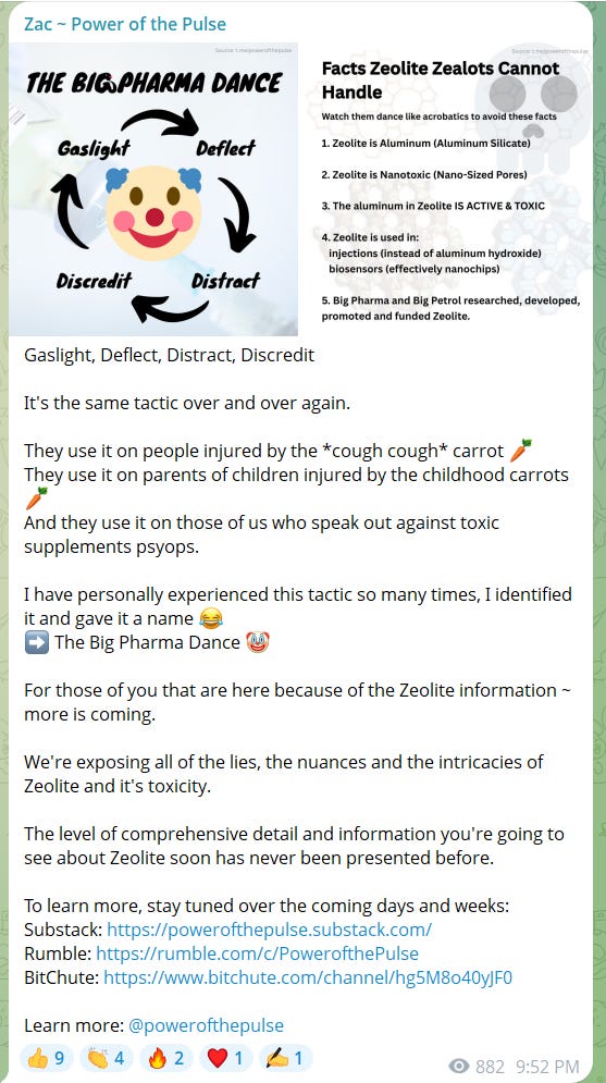 https://t.me/powerofthepulse/632Of course, as any post on zeolite does… it inflamed a few zeolite zealots that thought they could talk absolute nonsense in response. Little do they know how many times I’ve done the dance. Once you get to a certain level of zeolite knowledge, it becomes impossible to play games. Perhaps I should write a whole article about this, but please remember this: the moment you see someone arguing using technobabble, turn on your alarm bells.