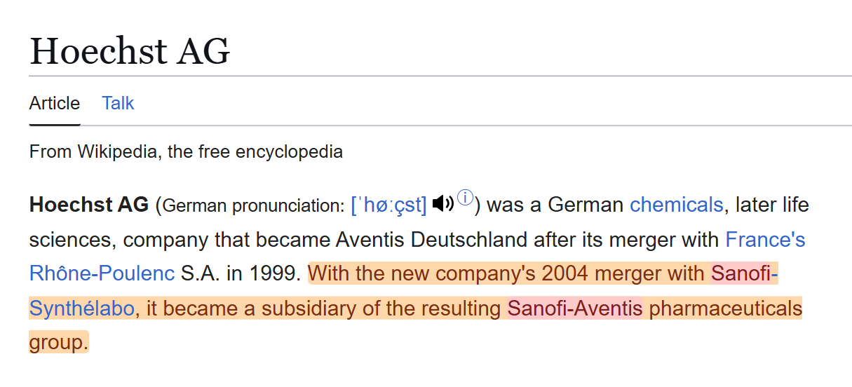 Hoescht was a chemical and pharmaceutical company that was part of the same chemical/pharmaceutical conglomerate as Bayer. They eventually became a subsidiary of Sanofi… another world-leading pharmaceutical.